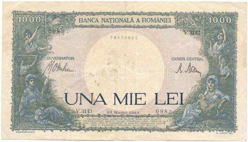 Romania 1... https://www.darabanth.com/hu/504-Gyorsarveres/504.0/Numizmatika/Kulfoldi-bankjegyek~4500061/Romania-1943-marcius-23-1000L-V3143-0982-TF3Cbr-3E-Romania-1943-Mar-23-1000-Lei-V3143-0~II3419384
