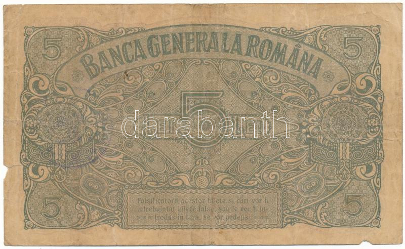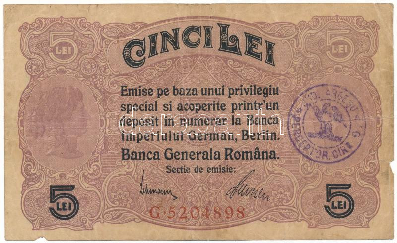 Románia / Német megszállás DN(1917) 5L 7 jegyű sorszám "G. 5204898", kék "JND. ARGESU PERCEPTOR. CIR" felülbélyegzéssel T:F,VG, pici anyaghiány