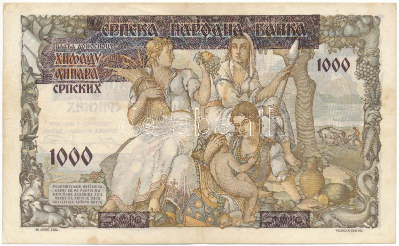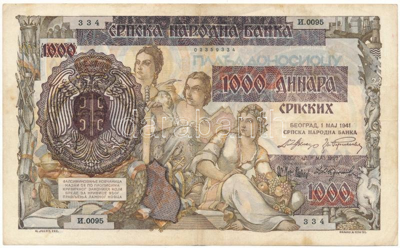 Szerbia / Német megszállás 1941. 1000D felülbélyegzett ideiglenes kiadás "I.0095 334" T:F, szép papír