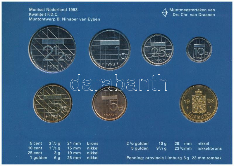 Leírás: Hollandia 1993. 5c-2 1/2G (6xklf) forgalmi sor karton tokban, pénzverdei zsetonnal, fólia borítékban T:UNC