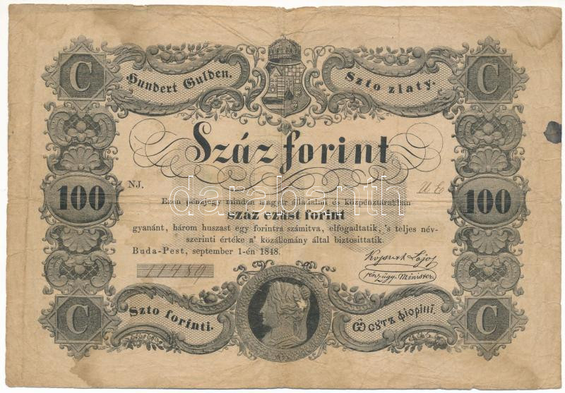 Leírás: 1848. 100Ft "Kossuth bankó ", "NJ. 11489" T:VG, pici szakadások, tintafolt