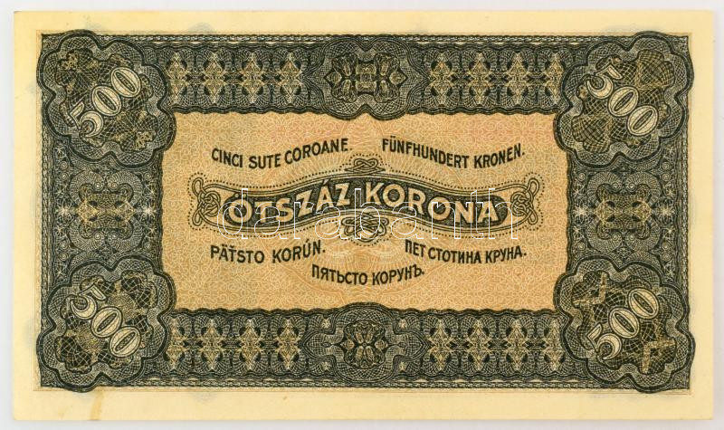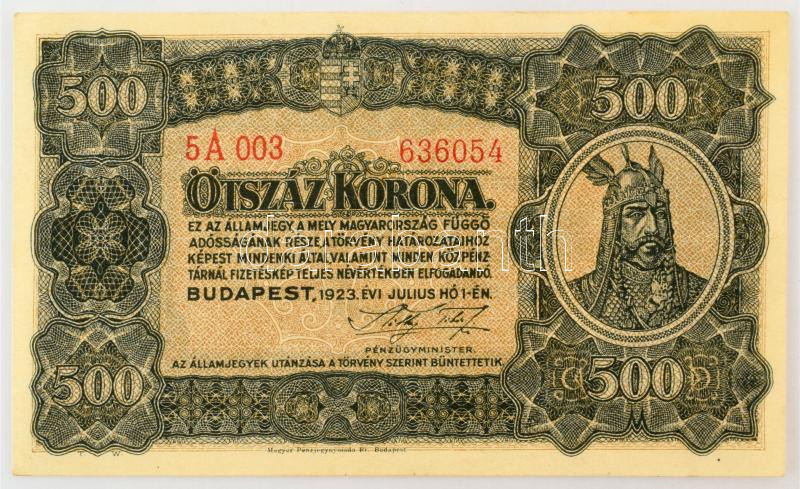 Leírás: 1923. 500K "5A 003 636054", "Magyar Pénzjegynyomda Rt. Budapest " nyomdahely jelöléssel T:AU,XF, hajtatlan csak sarokhajlások