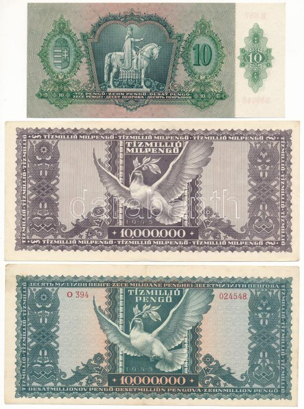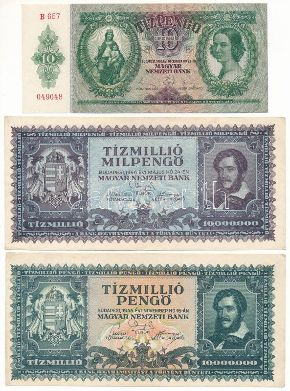 Leírás: 1936. 10P "B 657 049048" + 1945. 10.000.000P + 1946. 10.000.000MP T:AU, F szép papír