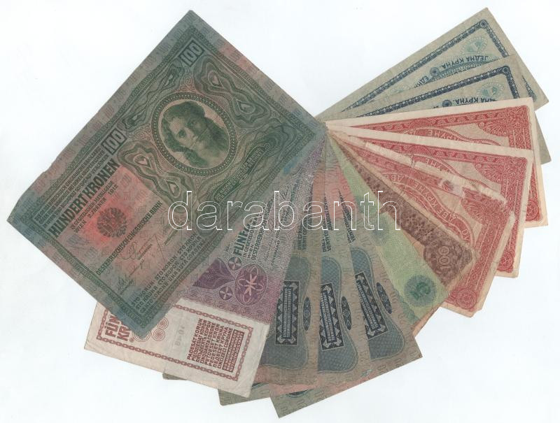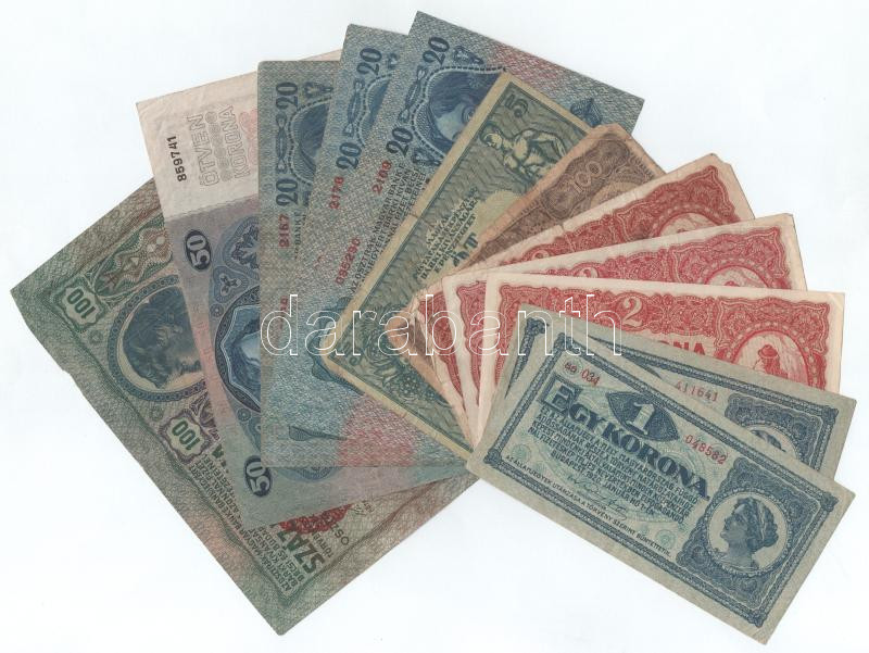 Leírás: Vegyes, 12db-os korona bankjegy tétel, benne 1912. 100K piros "MAGYARORSZÁG" felülbélyegzéssel + 1913. 20K (3x) + 1914. 50K + 1919. 5K "MÁS TÖRVÉNYES... ", "010 951.376" gyenge tartásban + 1920. 2K (3x), ebből 2x csillagos sorszámmal + 1K (2x) + 1923. 100K T:F-G