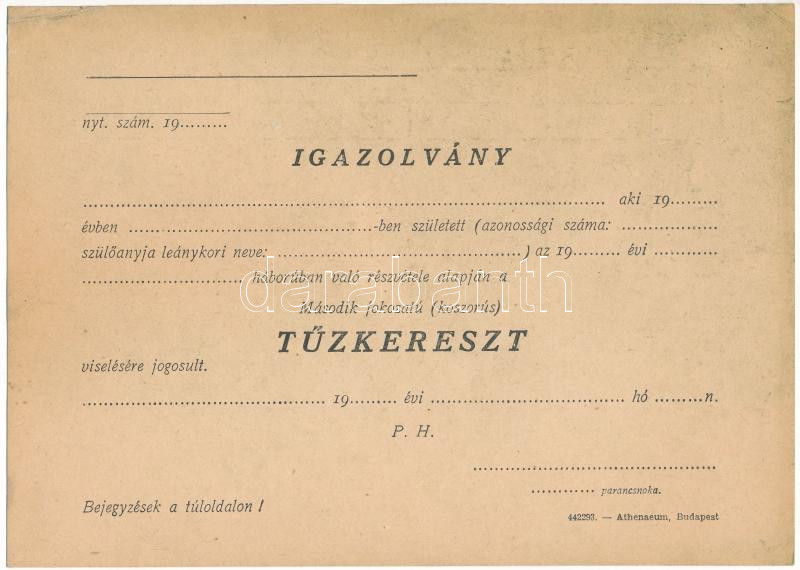 Leírás: 1942. "Tűzkereszt II. fokozata " bronzozott hadifém kitüntetés mellszalag nélkül és kitöltetlen viselői igazolvánnyal T:VF,F, oxidáció, bronzozás kopott