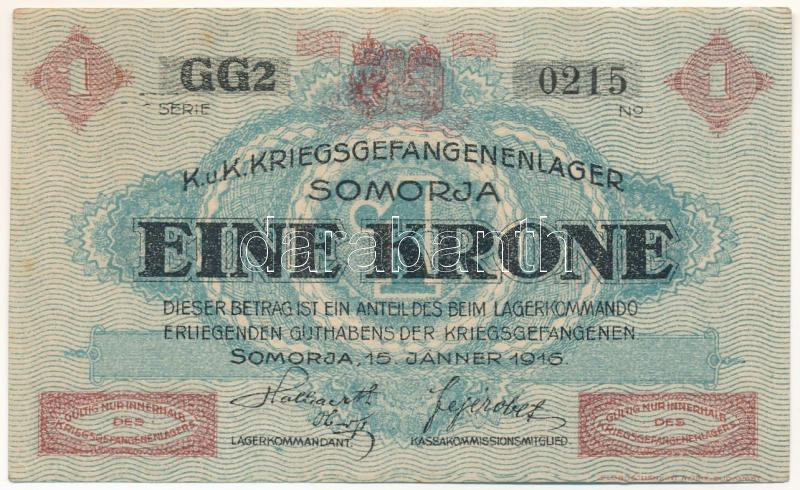 Hungary / Somorja (Šamorín) / POW Camp January 15th 1916. 1 Korona with double capital letters and one number series and arabic serial number "GG2 0215" C:AU, folded corner