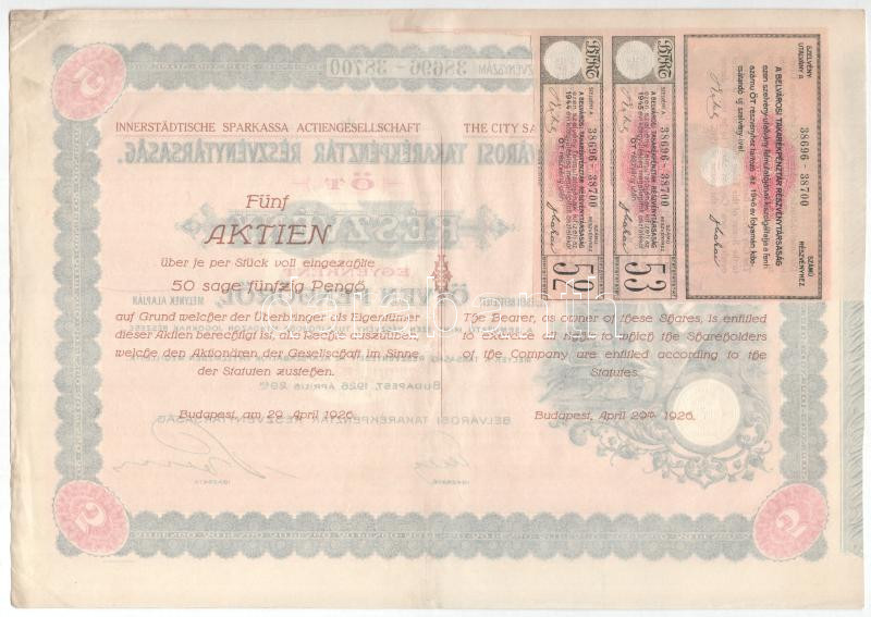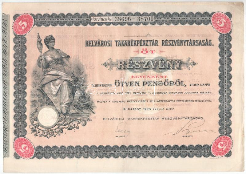 1926. Budapest "Belvárosi Takarékpénztár Részvénytársaság" ö... https://www.darabanth.com/hu/504-Gyorsarveres/504.0/Numizmatika/Reszvenyek-es-sorsjegyek~4500052/1926-Budapest-3Cem3EBelvarosi-Takarekpenztar-Reszvenytarsasag3Cem3E-ot-reszvenye-egyben-2~II2920495
