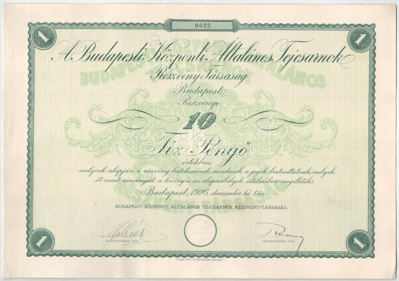 1926. Budapest "Budapesti Központi Általános Tejcsarnok Részvényt... https://www.darabanth.com/hu/504-Gyorsarveres/504.0/Numizmatika/Reszvenyek-es-sorsjegyek~4500052/1926-Budapest-3Cem3EBudapesti-Kozponti-Altalanos-Tejcsarnok-Reszvenytarsasag3Cem3E-reszveny~II2970578