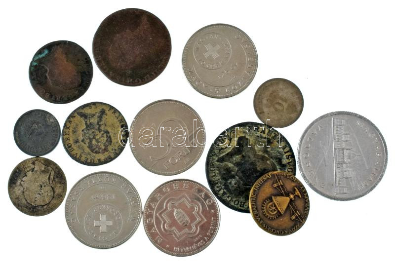 Vegyes, 13db-os, főleg érméből álló tétel, benne Ausztria 1864A 10kr Ag "Ferenc József" gyenge állapotban + 1868. 20kr Ag "Ferenc József" + Madarassy Walter (1909-1994) 1938. "XXXIV. Eucharisztikus Világkongresszus" bronz jelvény (23mm) T:vegyes