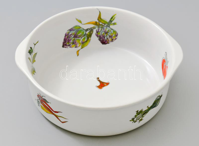Leírás: Porcelán zöldségsütő tál, klf zöldségek képével díszítve, jelzés nélkül, d: 21,5 cm