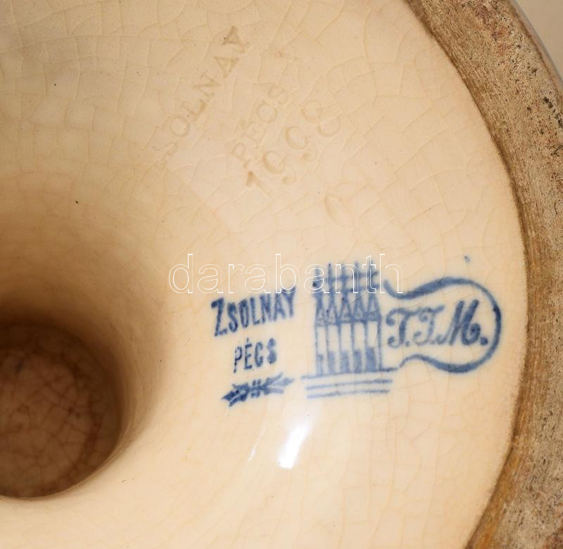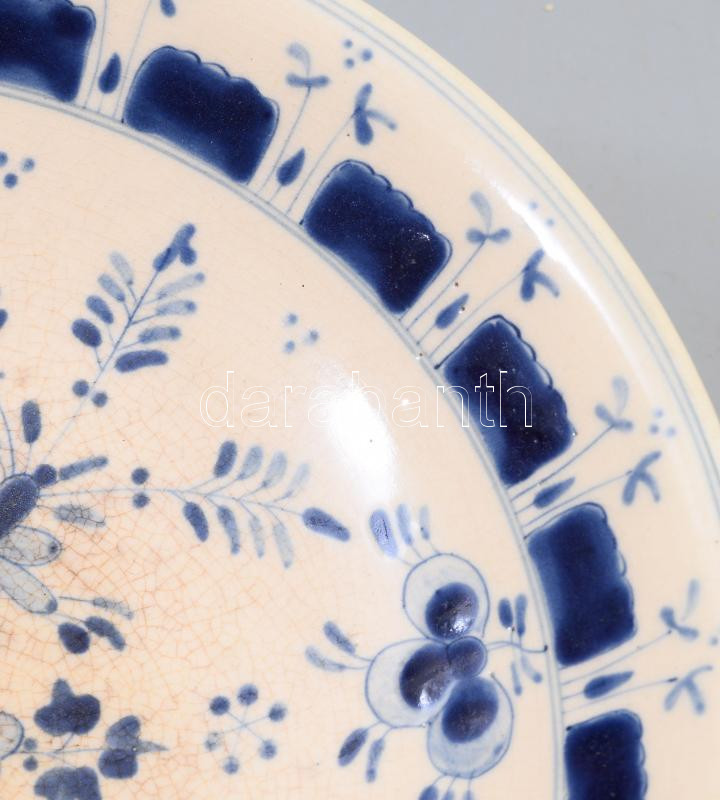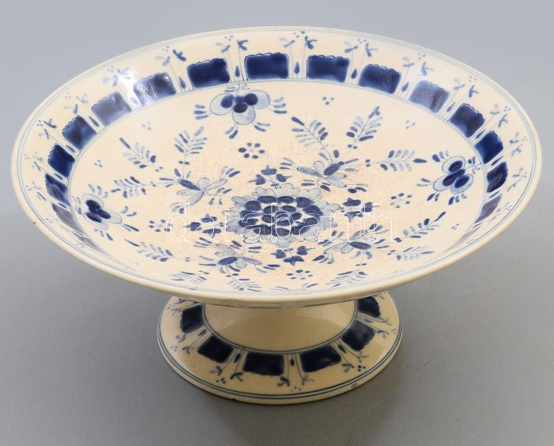 Zsolnay talpas kínáló. 1870 körül, máz alatti kobaltkék virágmintával festett korongozott finomfajansz, alján jelzett: máz alatti családi pecsét, formába nyomott Zsolnay Pécs felirat. Mázrepedéssel, 3 kisebb lepattanással, d: 22,5 cm, m: 9,5 cm