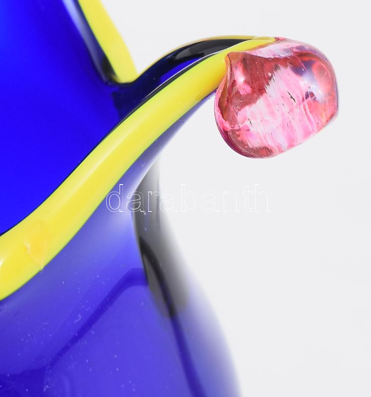 Leírás: Murano királykék hutaüveg váza, sárgaüveg peremezéssel és lilaüveg csúcsdíszezéssel, jelzés nélkül, hibátlan, m: 29 cm