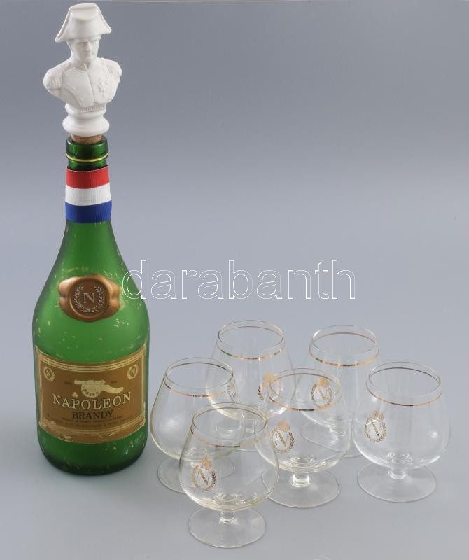 Leírás: Napoleon brandy üveg, Napoleon porcelán büszt dugóval, 6 darab Napoleon brandy pohárral.