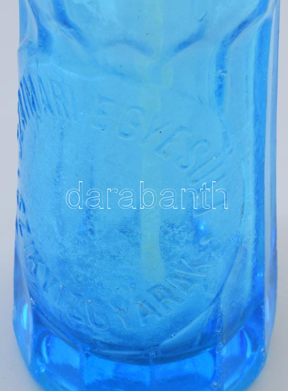 Leírás: Szatmári Egyesült Szikvizgyársak régi erdélyi királykék bordás szódás üveg, pattogzásokkal, m: 30 cm
