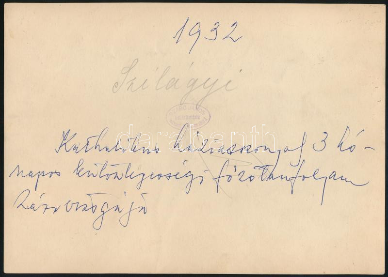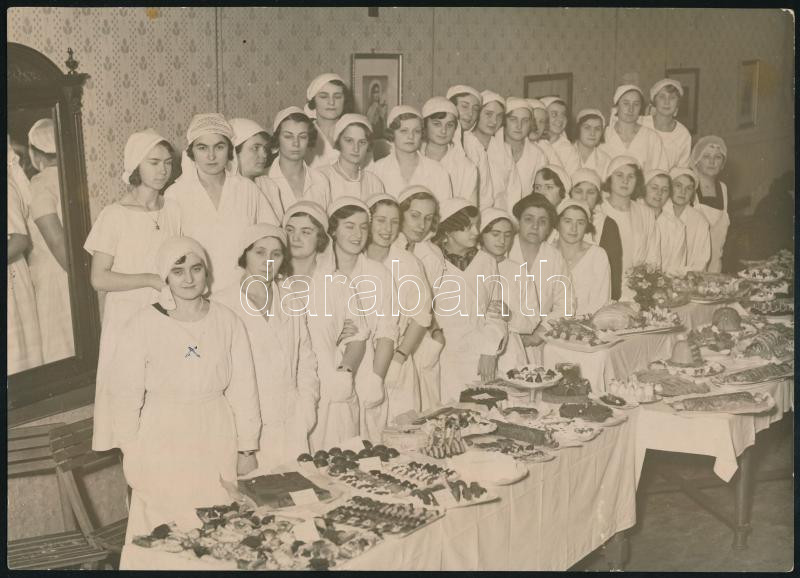 1932 A Katolikus Háziasszonyok 3 hónapos különlegességi főzőtanfolyam záróvizsgájáról készített fotó, Szabó János fényképész pecséttel jelzett fotója, jó állapotban, 17×23 cm
