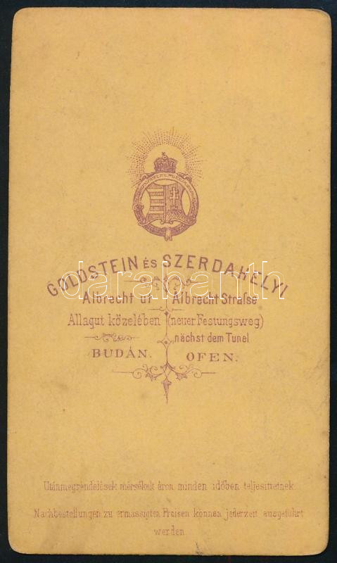 Leírás: cca 1865 Három elegáns hölgy (anya, lánya és nagymama?) portréja, vizitkártya Goldstein és Szerdahelyi budai műterméből, 10x6 cm