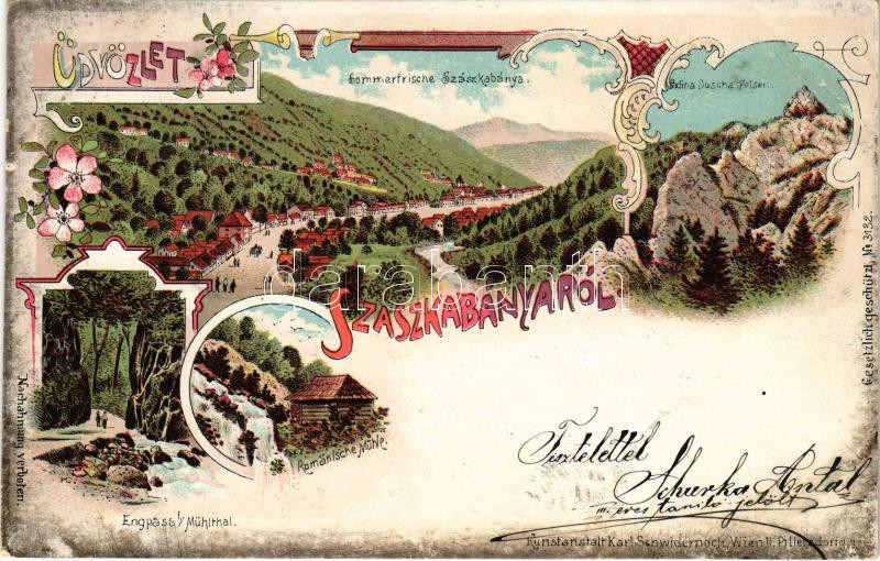 Leírás: 1899 Szászkabánya, Németszászka, Sasca Montana; Román malom, völgy sétány, szikla / Engpass i. Mühlthal, Rumänische Mühle, Padina Duscha Felsen. Kunstanstalt Karl Schwidernoch / Romanian mill, valley path, rocks. Art Nouveau, floral, litho (Rb)