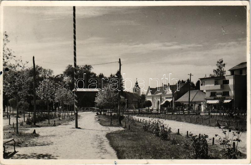 Leírás: 1944 Kovászna, Covasna; Országzászló, Hadnagy Gyula bazár, Turóczy nyomda, Kállay Pál üzlete / Hungarian flag, shops (EK)