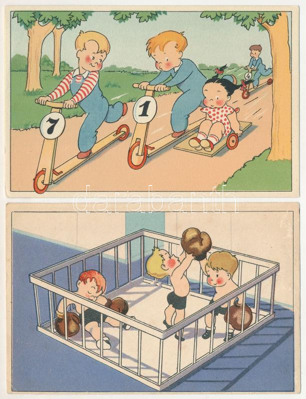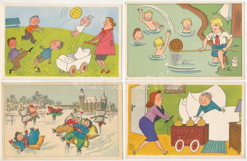 Leírás: 8 db MODERN humoros grafikai művészlap: gyerekek (Képzőművészeti Alap) / 8 modern Hungarian children humour graphic art postcards (1960s)