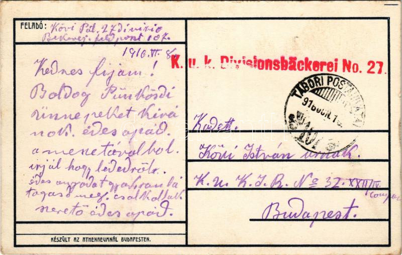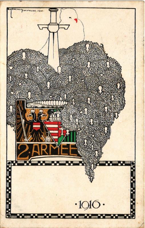 1916 Im Felde. 2. Armee / Első világháborús osztrák-magyar szecessziós katonai üdvözlet a 2. hadseregtől / WWI Austro-Hungarian K.u.K. military greeting art postcard. Athenaeum Art Nouveau s: G. v. Lőrincz + "K.u.k. Divisionsbäckerei No. 27" + "Tábori postahivatal 107" (EK)