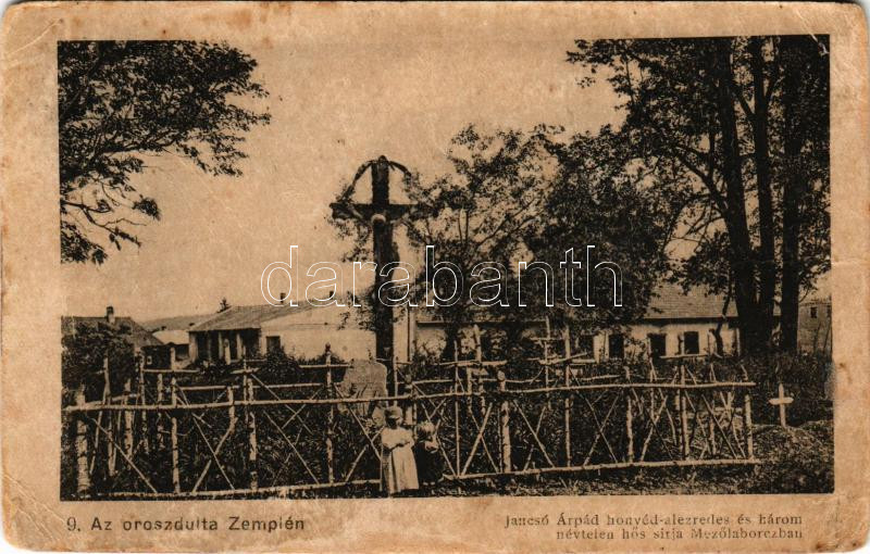 1916 Mezőlaborc, Medzilaborce; Az oroszdúlta Zemplén. Jancsó Árpád honvéd alezredes és három névtelen hős sírja, kápolna. Danielisz Lajos kiadása / WWI K.u.K. military heroes' cemetery after the Russian attack, chapel (felületi kopás / worn surface)