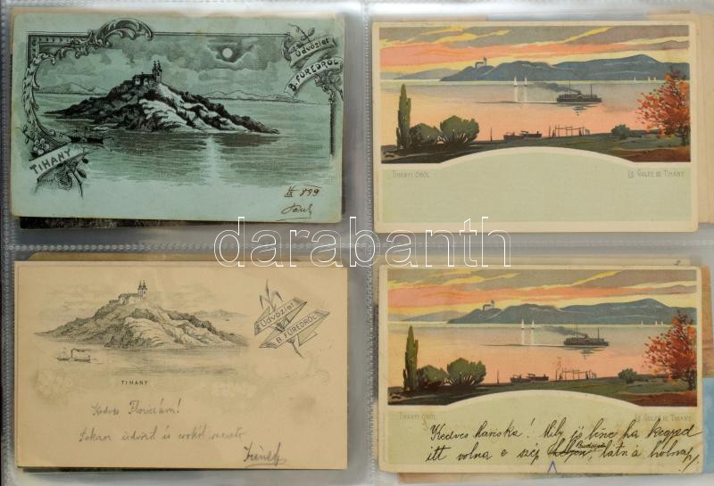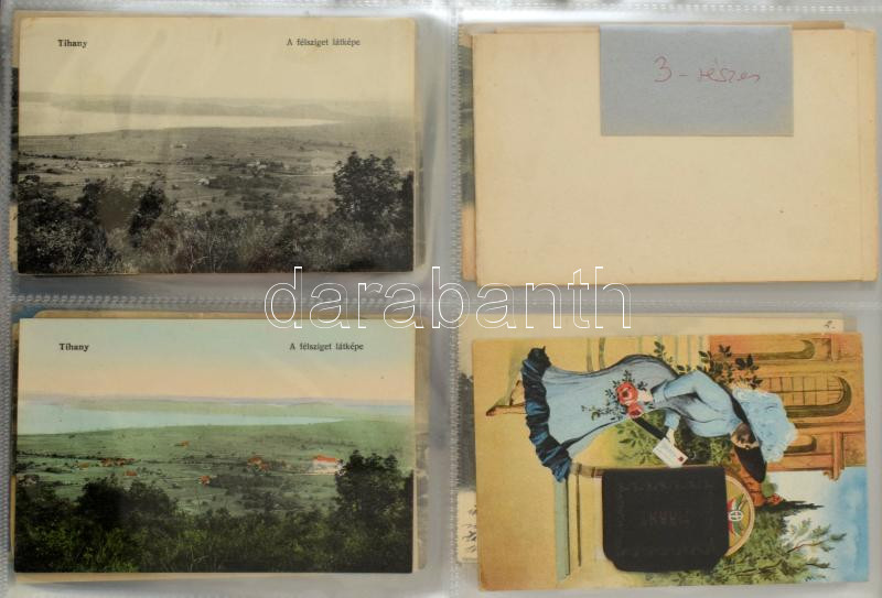 TIHANY - hatalmas RÉGI képeslap gyűjtemény Bantex 4-részes képeslap tokokban, lefűzhető gyűrűs mappába rendezve: 61 db 1918 előtti (közte lithok), 216 db 1918 utáni lappal, nyomási változatokkal, nagyon szép anyag! / Enormous pre-1945 postcard collection from the Hungarian town Tihany (lake Balaton), with lithos, in a modern album