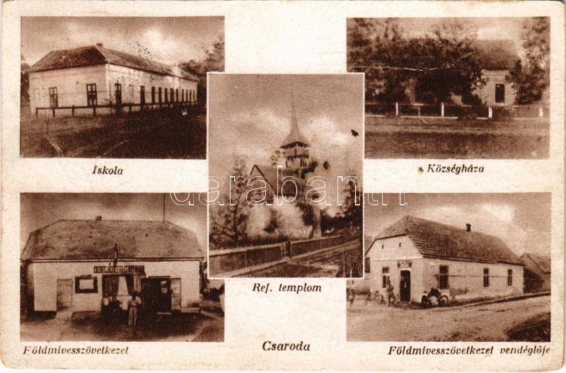 Leírás: Csaroda, iskola, községháza, református templom, Földmívesszövetkezet vendéglője, étterem. Özv. Horváth Richárdné kiadása (gyűrődés / crease)