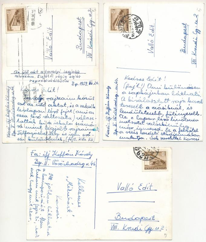 3 db MODERN fotós képeslap: ifj. Koffán Károly (1940-) grafikusművész alkotásai, a művész saját kezű levelével és aláírásával (1959) / 3 modern photo postcards depicting graphic arts of Károly Koffán jr., with the letter of the artist