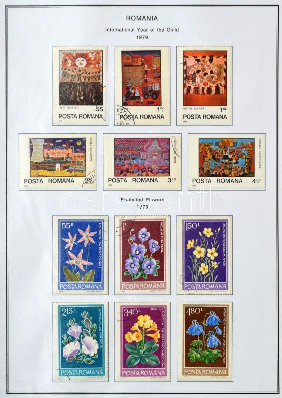 Leírás: Románia 1971-1979 Gyűjtemény sorokkal, blokkokkal, rendezett, jó minőségű anyag, előnyomott lapokon, gyűrűs borítóval (Mi EUR 411.-)