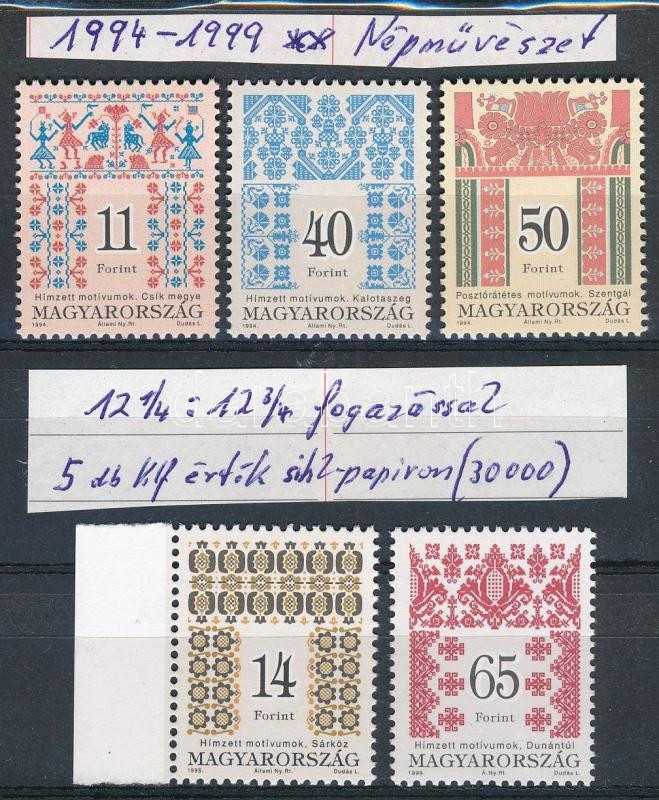 Leírás: 1994-1999 Népművészet 5 klf bélyeg sihl papíron, 12 1/4 : 12 3/4 fogazással (30.000)