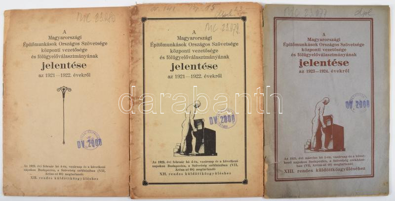 1922-1925 A Magyarországi ÉpÃtÅ‘munkások Országos Szövetsége központi vezetÅ‘sége és fölügyelÅ‘választmányának jelentése az 1921-1922. (2 db), 1923-1924. évekrÅ‘l. Bp.,1923-1925, Világosság-ny., 29+1 p.; 29+1 p.; 31 p. Kiadói papÃrkötés, egy borÃtóhiánnyal, szakadt borÃtókkal, régi bélyegzésekkel.