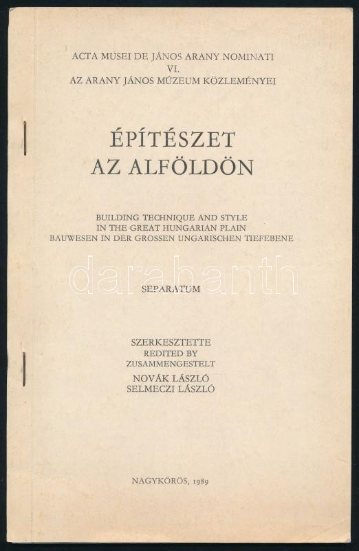 Leírás: Novák-Selmeczi: Építészet az Alföldön. Az Arany János Múzeum Közleményei VI. Nagykőrös, 1989. Kiadói papírkötés, jó állapotban.