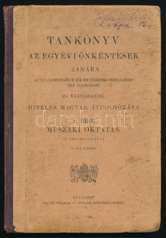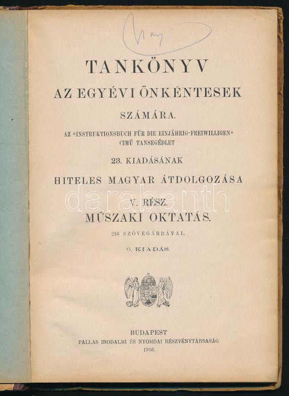 Tankönyv az egyévi önkéntesek számára. Az ,,Instruktionsbuch für die Einjährig-Freiwilligen" című tansegédlet 23. kiadásának hitelese magyar átdolgozása. V. rész. Műszaki oktatás. Bp., 1916, Pallas, 152 p. Szövegközti ábrákkal illusztrálva. Kiadói félvászon-kötés, viseltes borítóval, néhány lapon kisebb sarokhiánnyal, ceruzás bejegyzésekkel. (Ritka!)