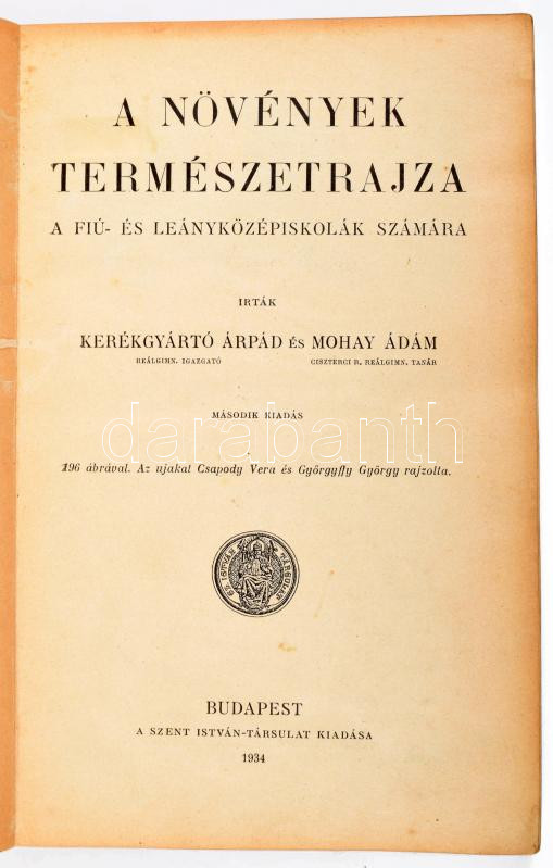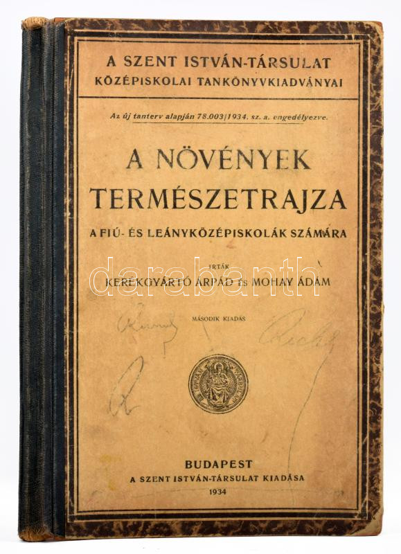 Kerékgyártó Árpád - Mohay Ádám: A növények természetrajza. A fiú- és leányközépiskolák számára. Bp., 1934, Szent István-Társulat, 114 p. II. kiadás. Átkötött félvászon-kötés, kopott borítóval.