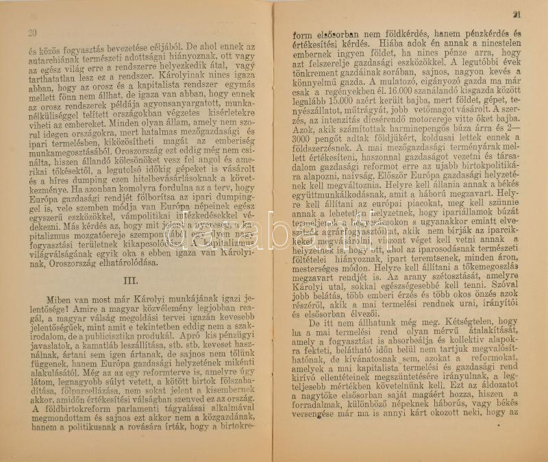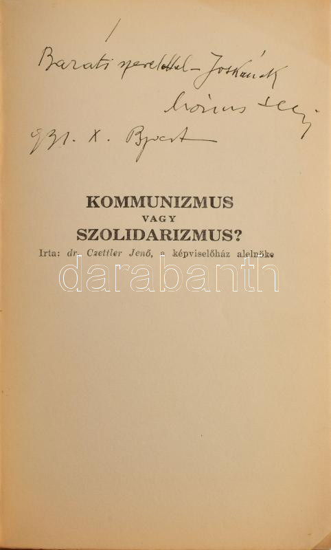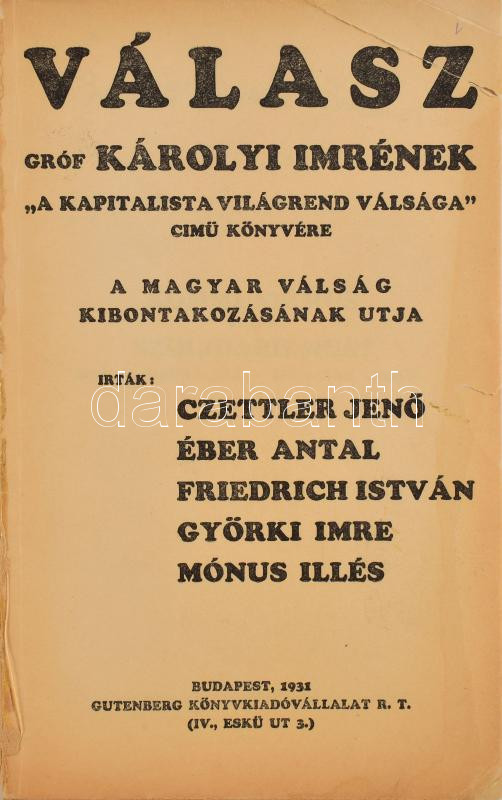 Czettler Jenő et al.: Válasz gróf Károlyi Imrének ,,A kapitalista világrend válsága" cimü könyvére. A magyar válság kibontakozásának utja. Az egyik szerző, Mónus Illés (szül. Brandstein Illés) (1888-1944) szociáldemokrata politikus, újságíró által dedikált példány. Bp., 1931, Gutenberg, 104 p. Egyetlen kiadás. Borító nélkül, sérült címlappal, a lapok nagyrészt jó állapotban.