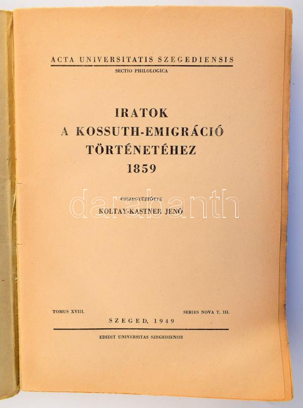 Koltay-Kastner Jenő: Iratok a Kossuth-emigráció történetéhez 1859. Összegyűjtötte: - - . Acta Universitatis Szegediensis. Sectio Philologica. Tomus XVIII. Series Nova T. III. Szeged, 1949, Szegedi Tudományegyetem, 280 p. Kiadói papírkötés, kissé viseltes, helyenként kissé sérült lapszélekkel.