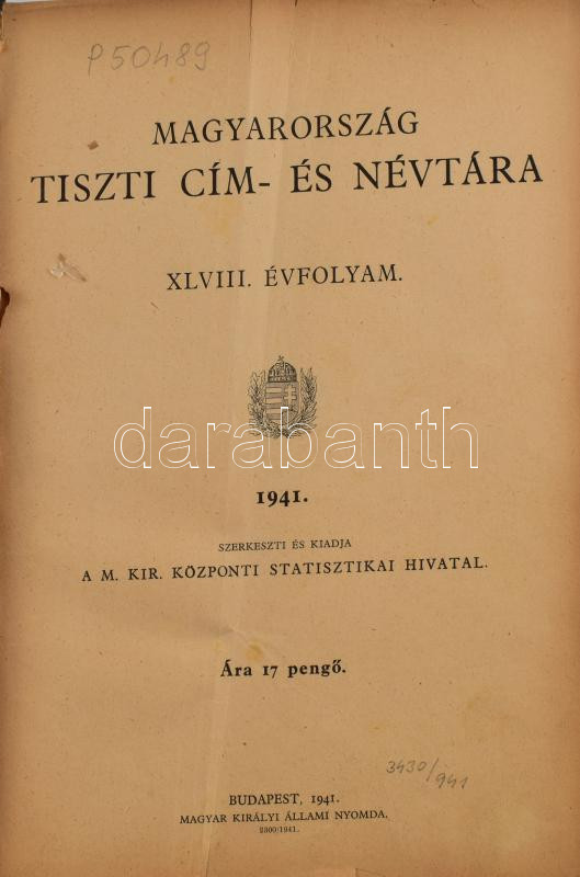 1941 Magyarország tiszti cím- és névtára. XLVIII. évf. Szerk. és kiadja a M. Kir. Központi Statisztikai Hivatal. Bp., 1941, M. Kir. Állami Nyomda, XIX+(1)+868 p. Kiadói egészvászon-kötés, kissé sérült, kopottas borítóval és gerinccel, sérült címlappal, néhány kijáró lappal.