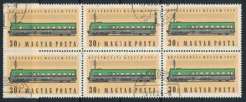 1959 Közlekedési Múzeum I. 30f hatostömb, a 4. bélyegen hiányos "R" betű + a belső és jobb szélő bélyegeken enyhe színeltolódás (a sín felett fehér csík)