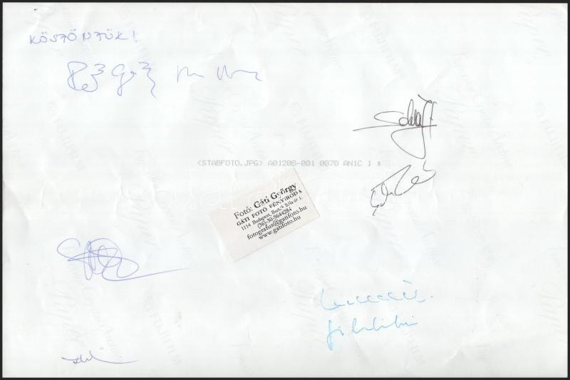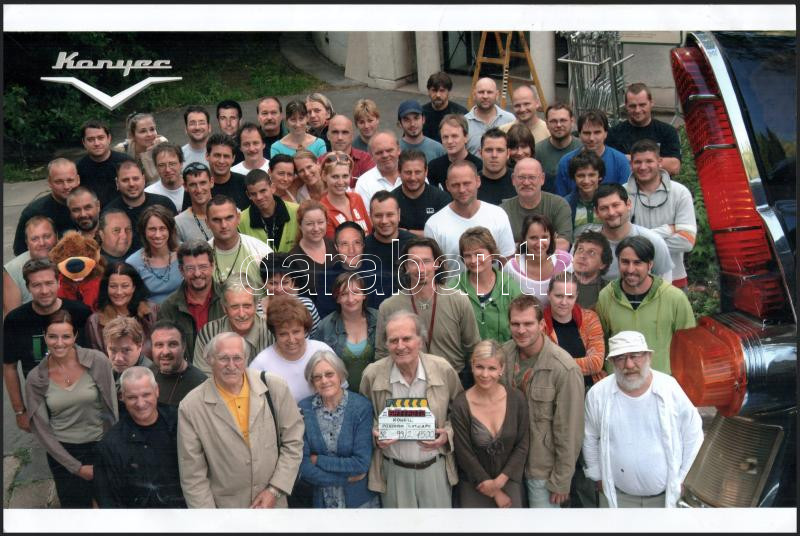 Konyec - Az utolsó csekk a pohárban c. film stábfotója, Gáti György felvétele, hátoldalán több szereplő/stábtag aláírásával, köztük Schell Judit (1973- ) színésznő, 30x20 cm