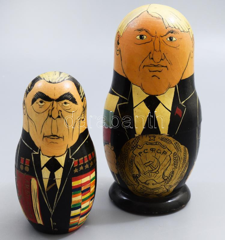 Leírás: 2 darab szovjet matrjoska baba, szovjet vezetők ábrázolásával, m: 12-16 cm