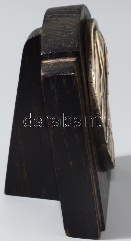 Leírás: Ezüstözött bronz Mária plakett, jelzett, kopott, fa tartón, m: 10,5 cm