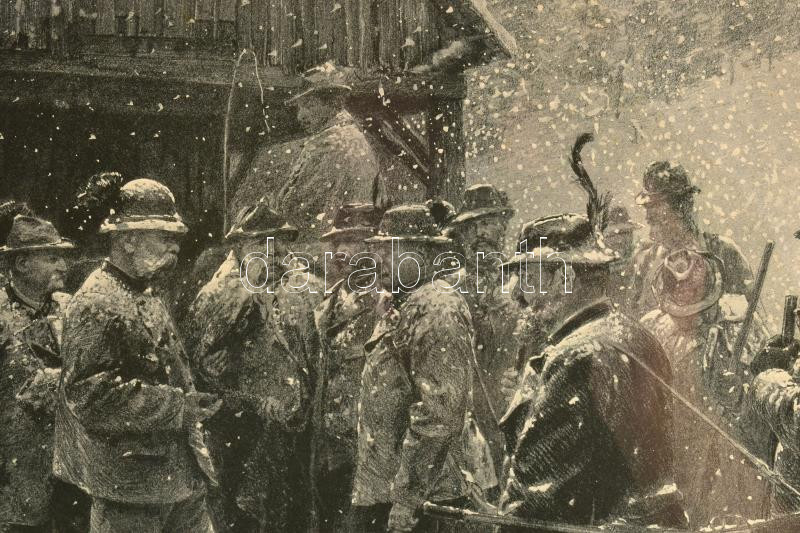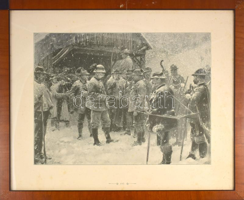 Leírás: Ferenc József vadászaton. Nagy méretű nyomat Gause grafikája alapján, üvegezett keretben. Keret mérete 45x37 cm