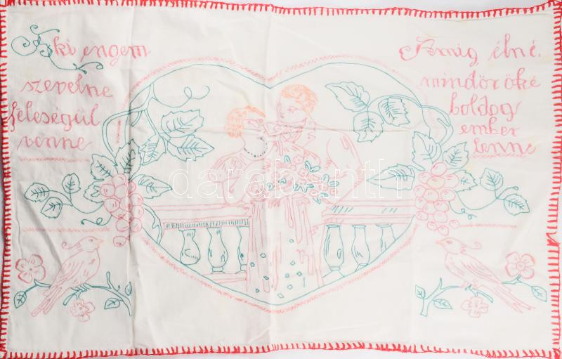 Leírás: Kézzel hímzett konyhai falvédő, "Aki engem szeretne feleségül venne, amig élne mindörökké boldog ember lenne" felirattal, 46x70 cm