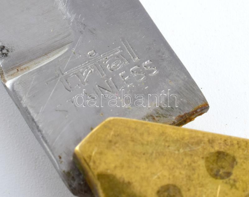 Leírás: Trial bicska, réz rárakásos fa nyéllel, jelzett, nyitva h: 18 cm