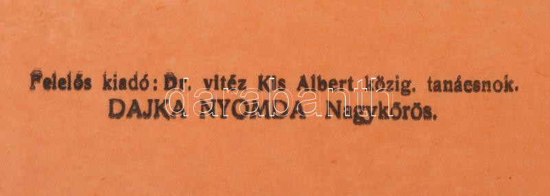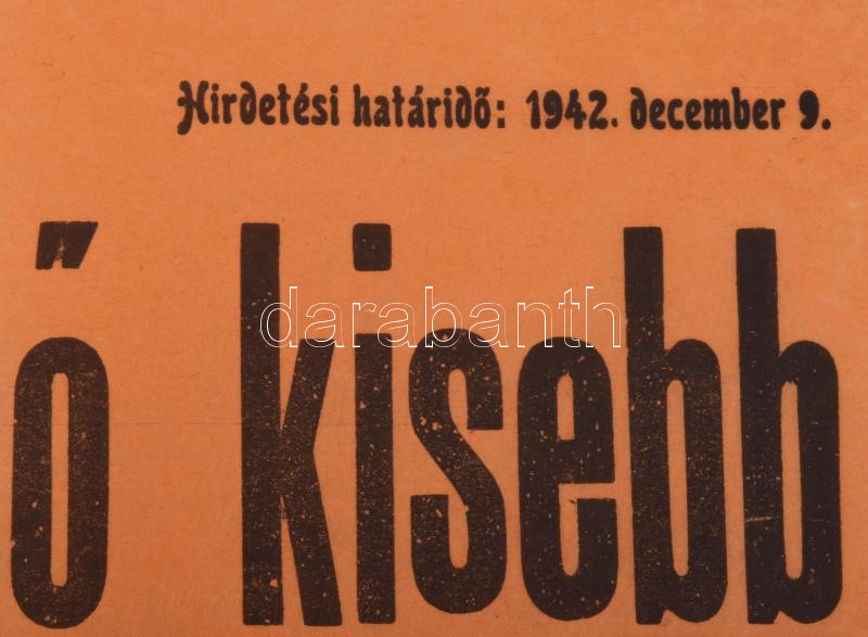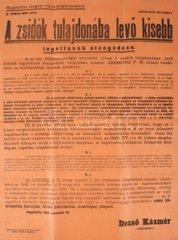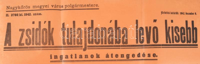 Leírás: 1942 Nagykőrös. A zsidók tulajdonában lévő kisebb ingatlanok átengedése c. polgármesteri rendelet. Nagy méretű plakát. Hajtva, jó állapotban 46x32 cm