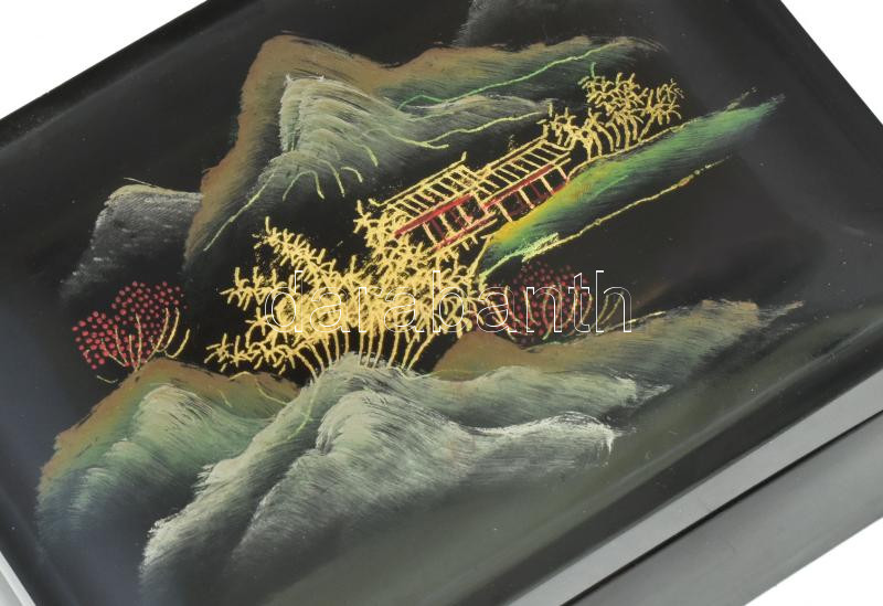 Leírás: Kínai lakkozott ékszeres doboz, jelzéssel, tájkép jelenettel, 14,5x10,5x8,5 cm