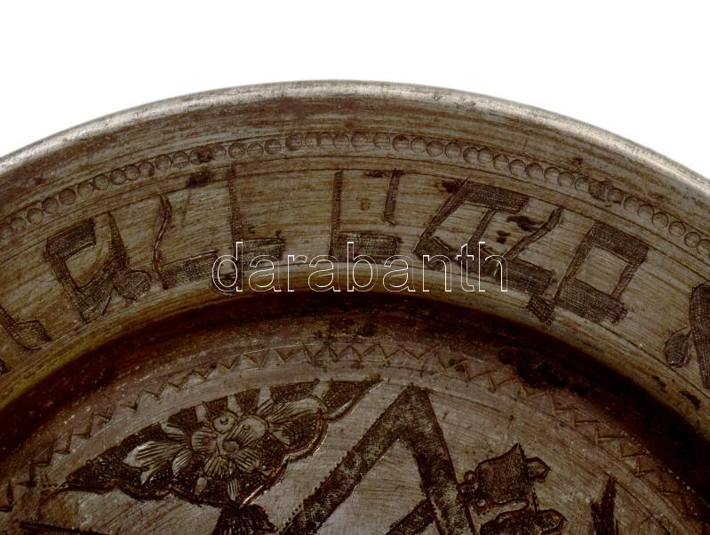 Leírás: Szédertál. Ónbevonatos réz, cca 19.sz. közepe - második fele, feltehetően német, d: 20,5 cm