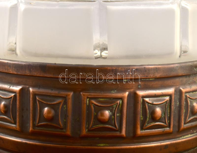 Leírás: cca 1910/1920 Jugendstil bécsi mennyezeti lámpa, rézlemez, savmaratott üvegbúrával, minimális kopottsággal, d: 32 cm