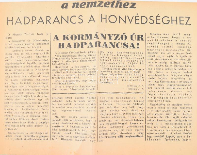 Leírás: 1944 A Horthy-féle kiugrási kísérlet bejelentése A Hétfői Magyarország c. lap számában. Facsimile másolat.