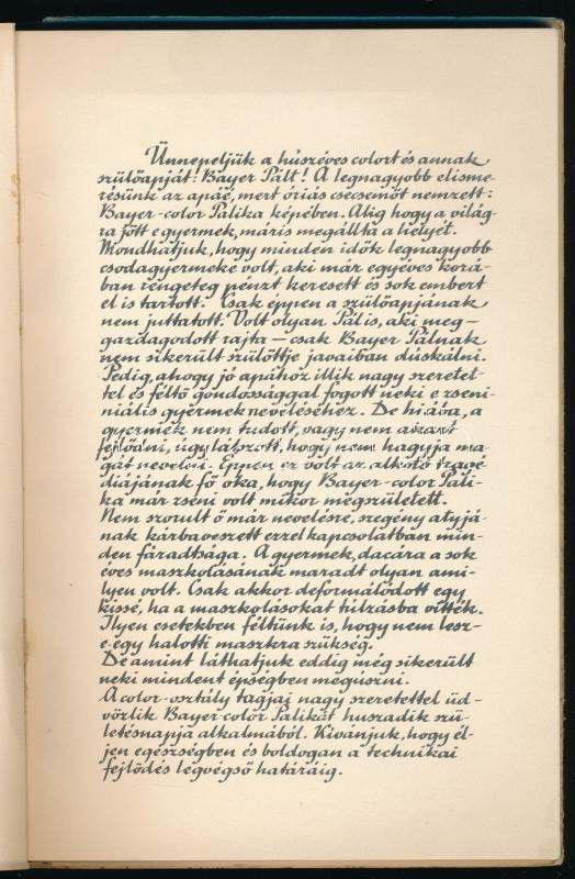 1953 Color - 20 év. ,,Ünnepeljük a húszéves colort és annak szülőapját: Bayer Pált! [...]" Jubileumi emlékkiadvány, számozott, 20./45 példány. Kiadói zsinórfűzéses papírkötés, kissé sérült borítóval, belül jó állapotban.